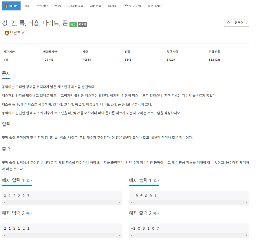 3003번: 킹, 퀸, 룩, 비숍, 나이트, 폰