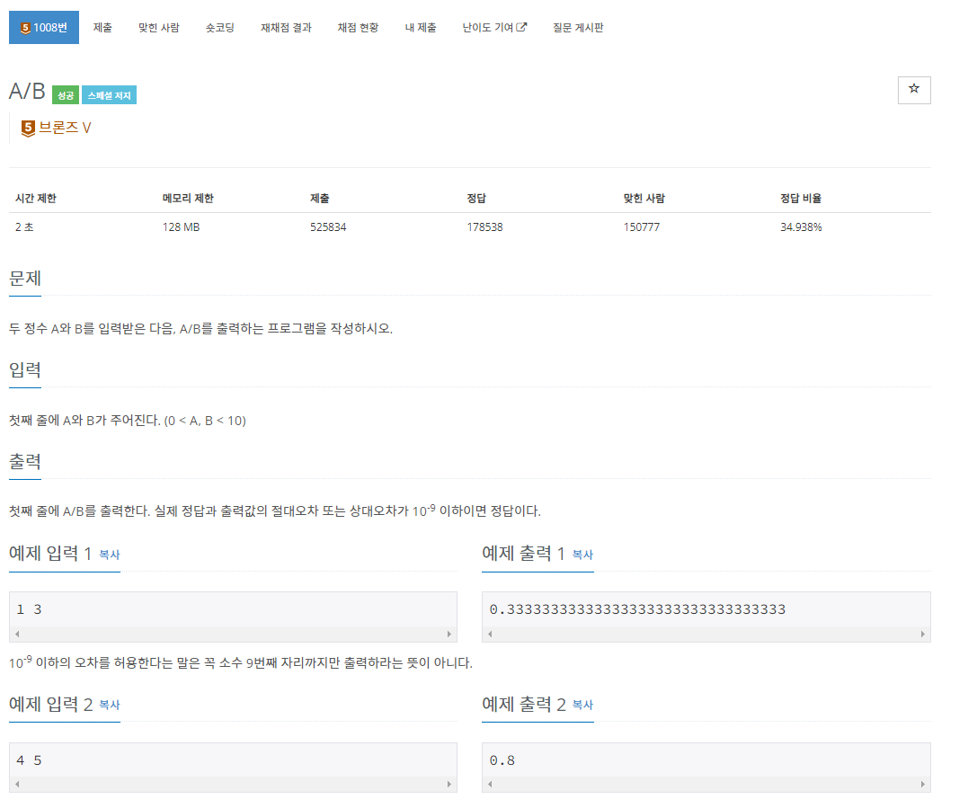 단, 10^-9이하의 오차를 허용하므로, 변수 A, B의 자료형을 double 자료형으로 해야하며, 출력시 최소한 소수점 9자리는 출력해야 한다.