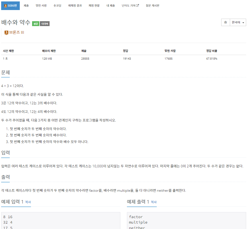 각 테스트 케이스마다 첫 번째 숫자가 두 번째 숫자의 약수라면 factor를, 배수라면 multiple을, 둘 다 아니라면 neither를 출력한다.