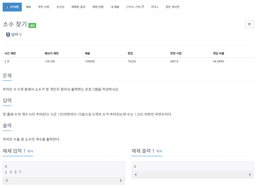 입력받은 각각의 수를 배열에 저장하고, 2중 for문을 이용해 배열에 저장된 수의 약수의 개수가 2개인 경우(1과 자기자신) 소수의 개수를 +1 증가시키면 된다.