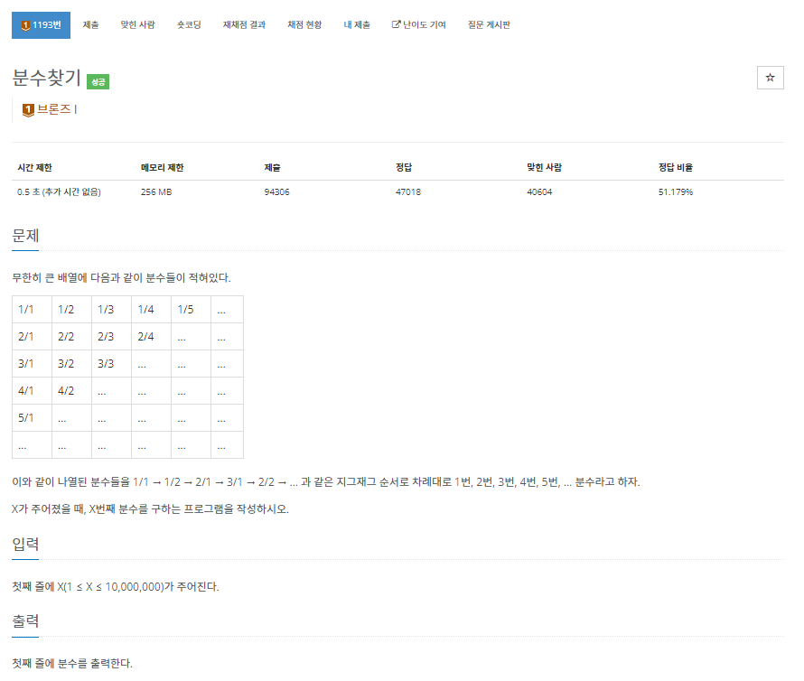 //짝수번째 줄 : 분자 - 오름차순, 분모 - 내림차순