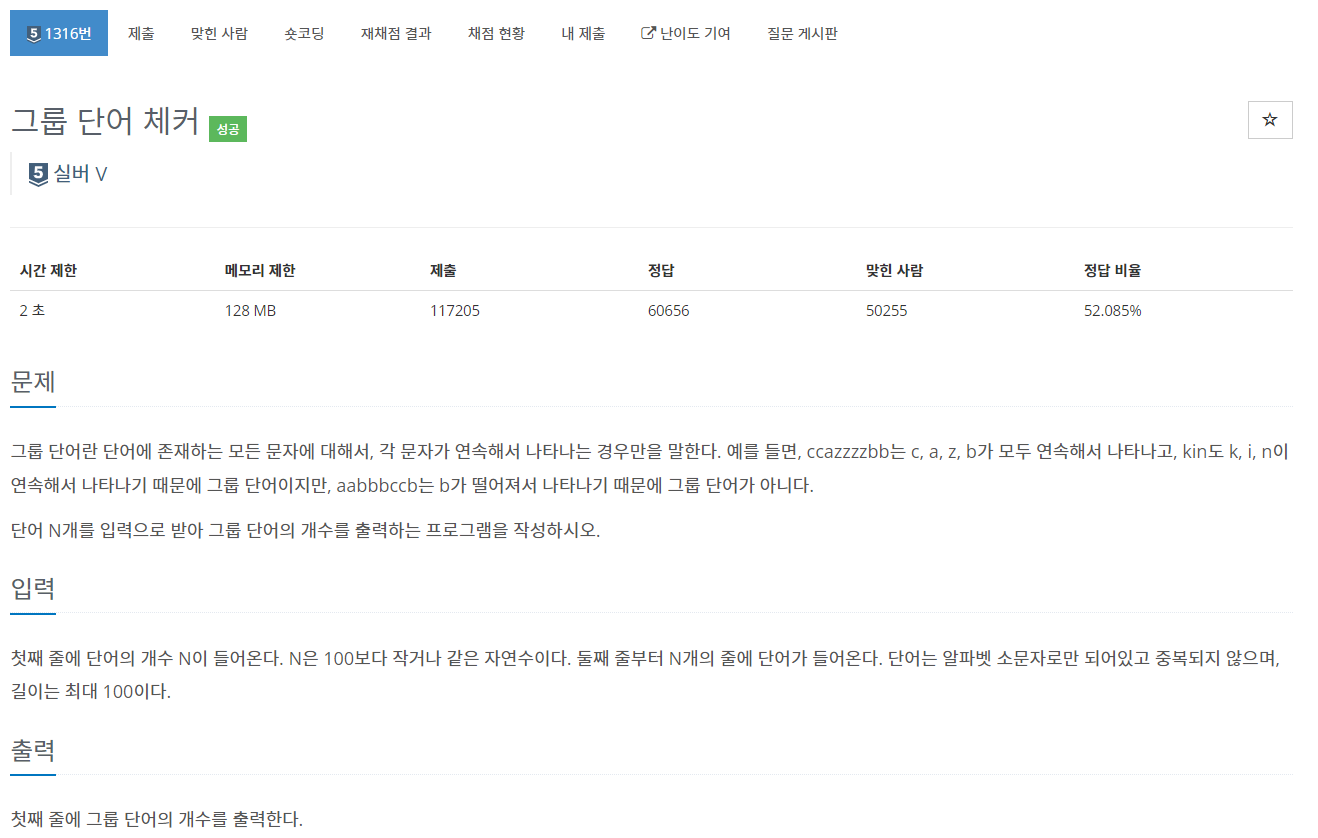 그룹 단어란 단어에 존재하는 모든 문자에 대해서, 각 문자가 연속해서 나타나는 경우만을 말한다. 예를 들면, ccazzzzbb는 c, a, z, b가 모두 연속해서 나타나고, kin도 k, i, n이 연속해서 나타나기 때